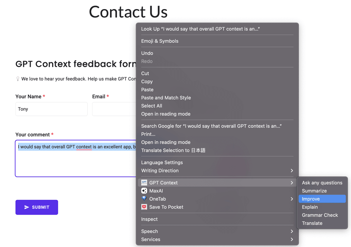 Whether you're writing an email, a thesis, or a blog post, GPT Context offers instant help right in your browser. Access common commands quickly to fix grammar mistakes, enhance your writing, or use your own prompts to guide ChatGPT effortlessly.